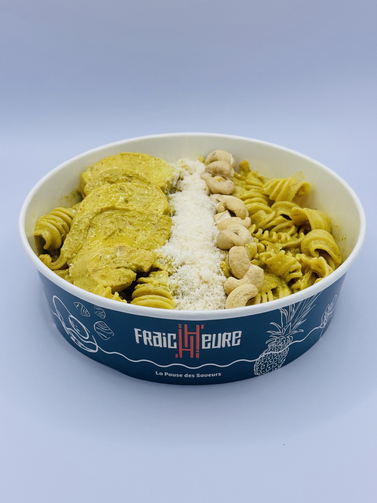 Radiatori, Filet de Saumon en croute de Pistache, Citrons Confits, Cébette. Les plats sont livrés froids, à faire réchauffer soi-même.