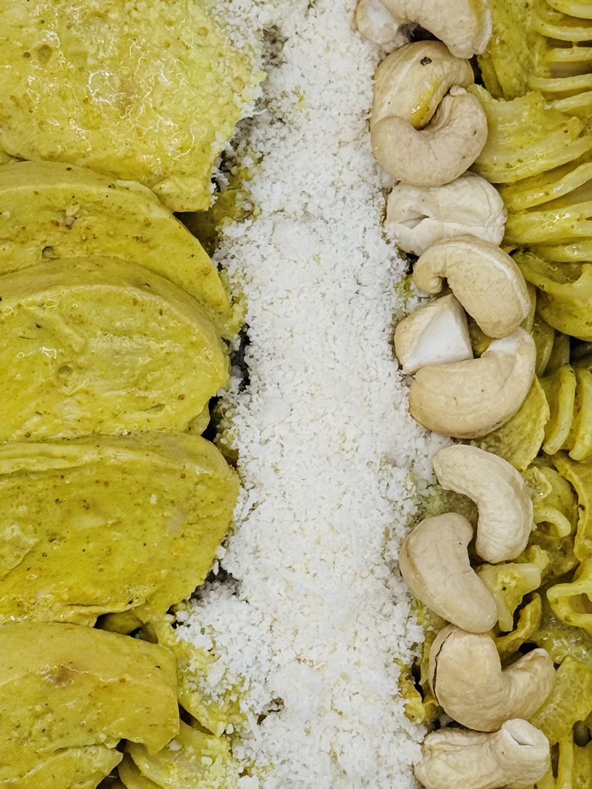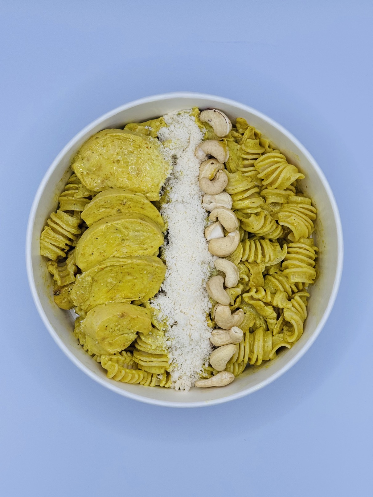 Radiatori, Poulet, Curry, Lait de Coco, Noix de Cajou, Oignons, Parmesan.