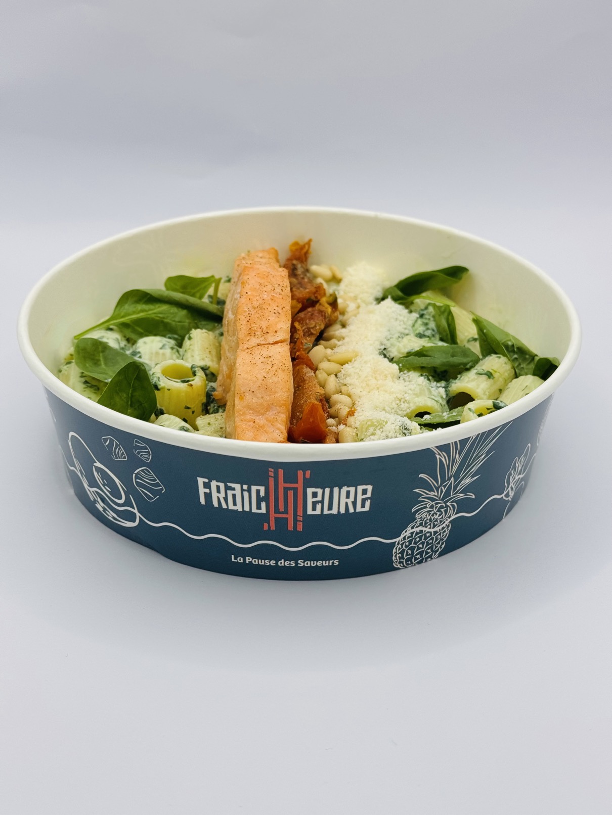 Rigatoni, Filet de Saumon, Tomates Confites, Crème d’Epinards à la Ricotta, Pignons de Pin, Parmesan.