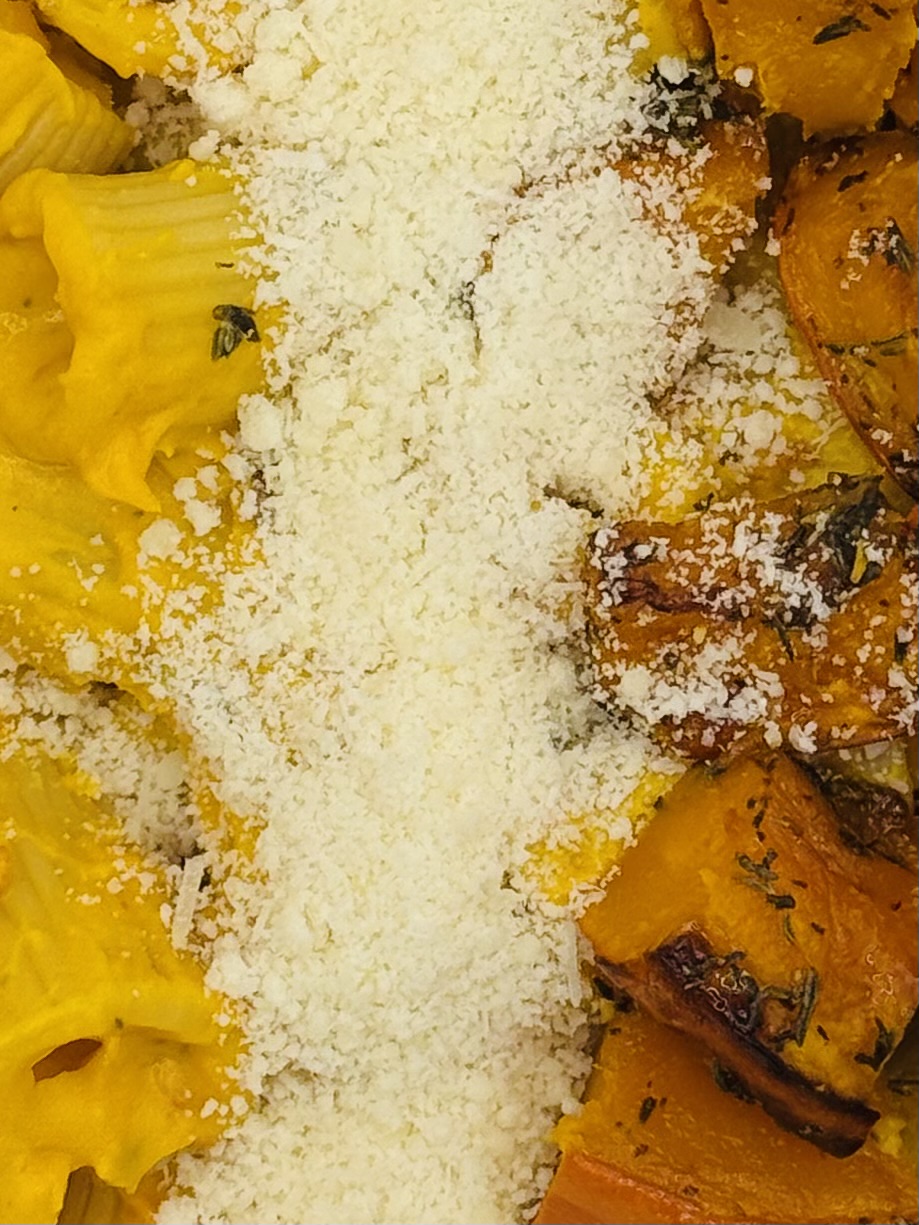 Rigatoni, Poulet, Potimarron Rôti au Thym, Crème de Potimarron, Parmesan.