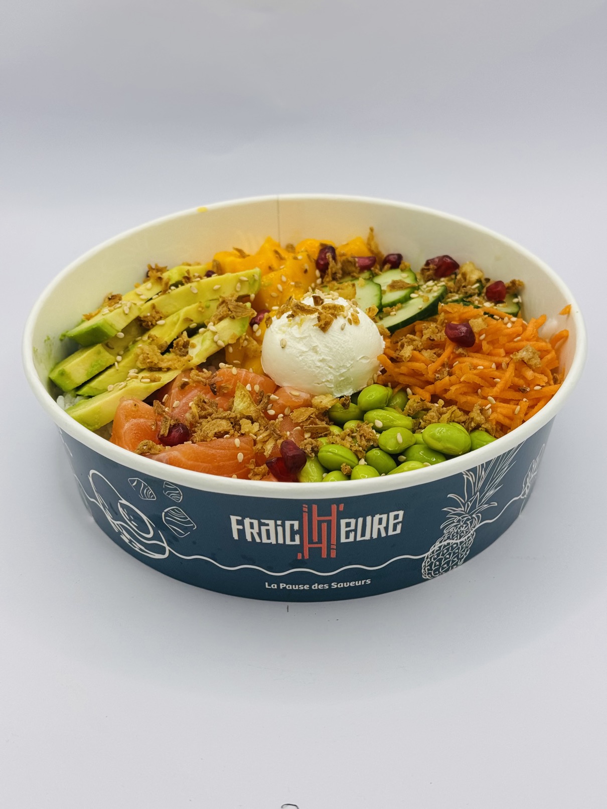 Riz Rond, Saumon Bömlo, Concombre, Mangue, Avocat, Carottes Râpées, Edamame, Creamy Cheese, Oignons Frits, Graines de Sésame, Grenade.