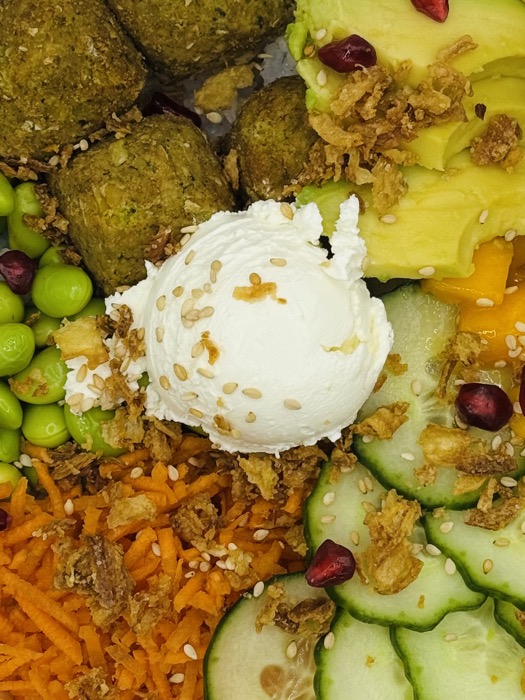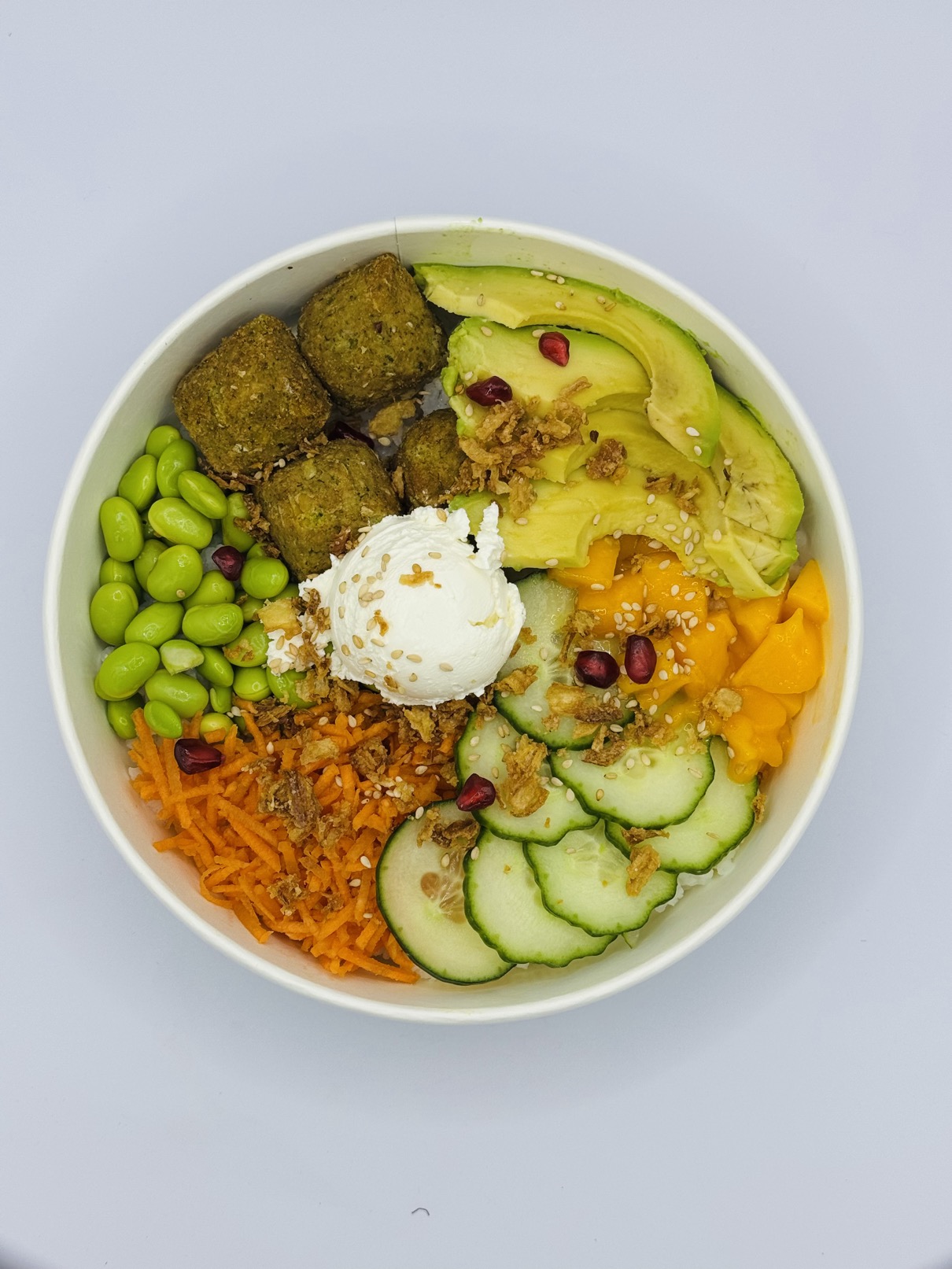 Riz Rond, Poulet Mariné, Concombre, Mangue, Avocat, Carottes Râpées, Edamame, Creamy Cheese, Oignons Frits, Graines de Sésame, Grenade.