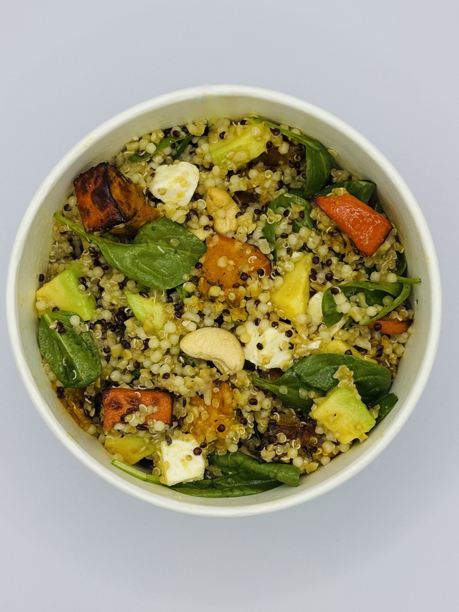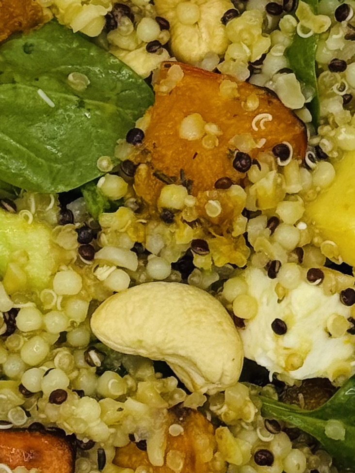 Quinoa, Avocat, Epinards, Féta, Potimarron Rôti au Thym, Noix de Cajou.