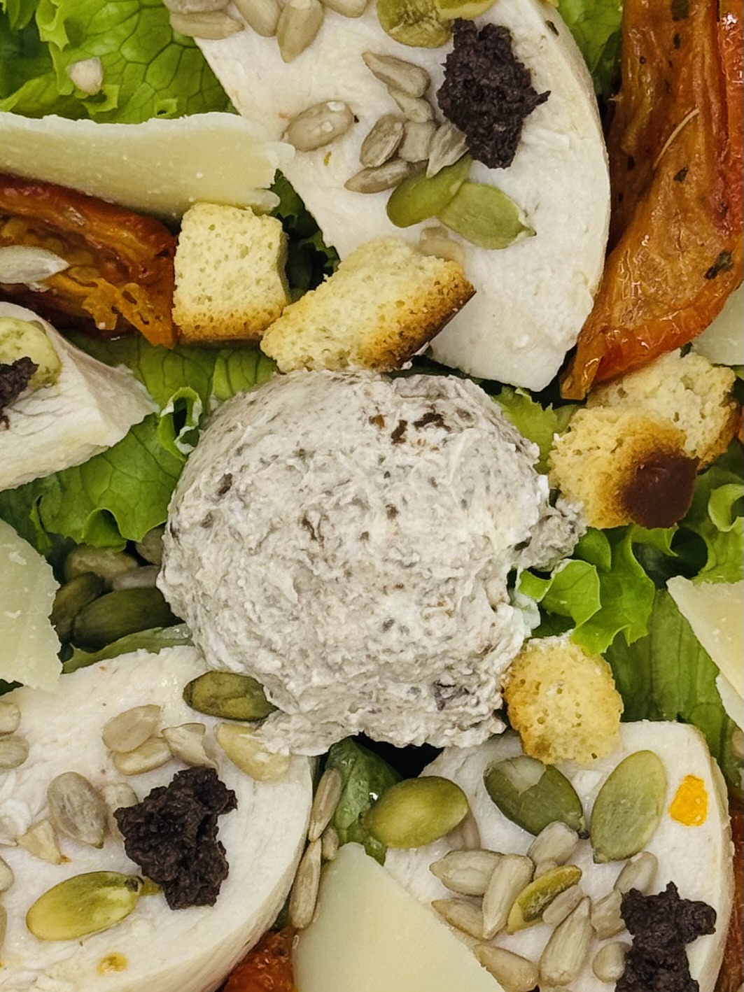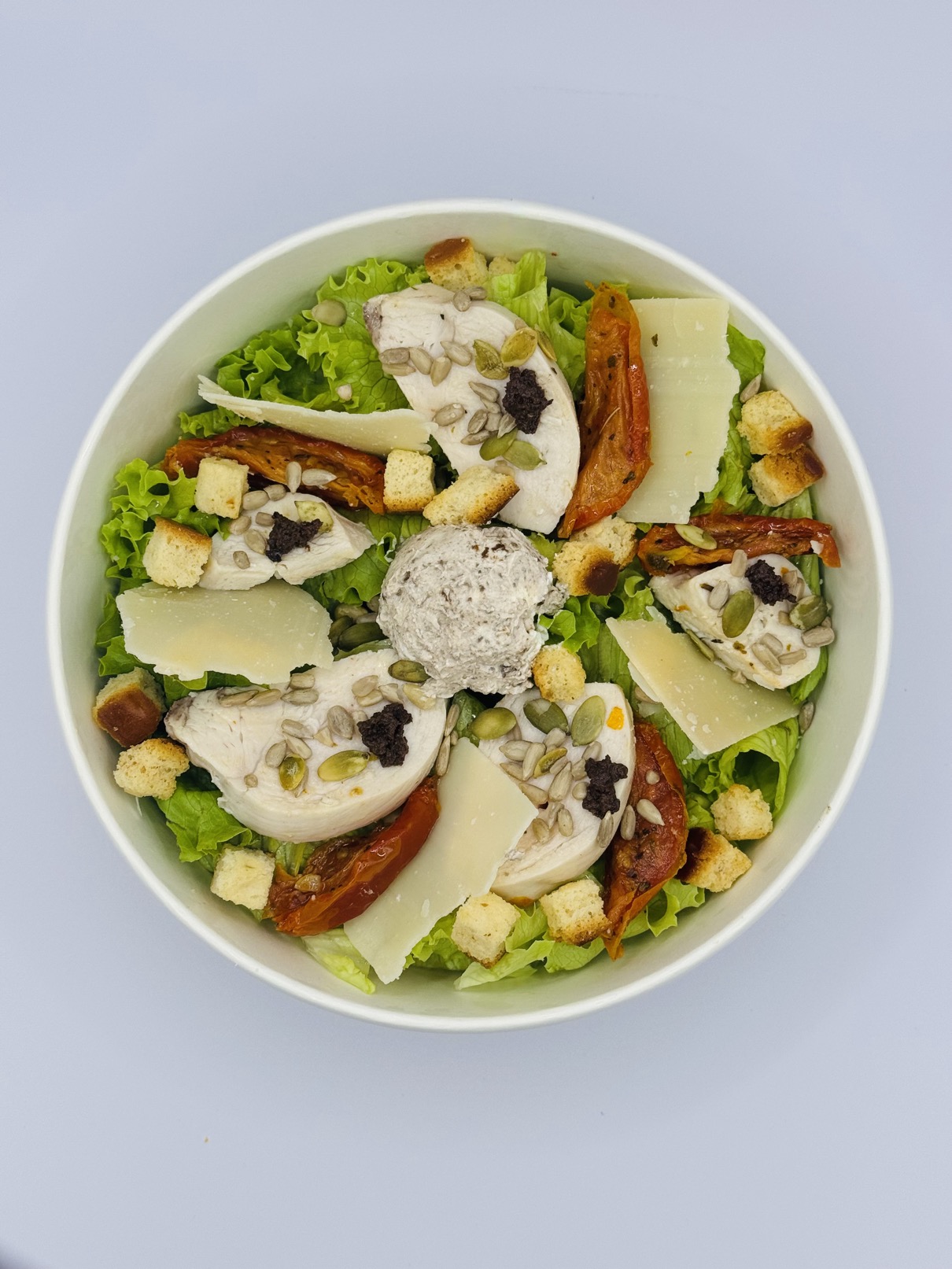 Batavia, Poulet, Tomates Confites, Crème de Tapenade, Céréales, Croutons, Parmesan.